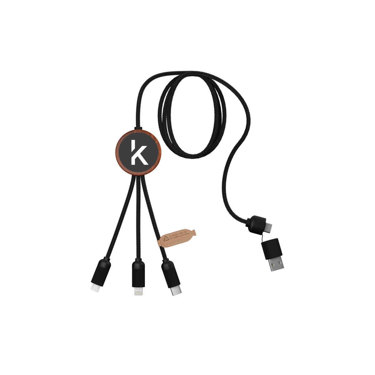 Ce câble publicitaire 5-en-1 permet de charger simultanément jusqu’à 3 appareils (USB-C, Lightning, micro-USB) grâce à ses multi-connecteurs universels. Doté d’une double entrée USB-A + USB-C, il est compatible avec tous les appareils récents (ordinateurs, smartphones, tablettes). Ses deux logos lumineux personnalisables, disponibles en option recto/verso, renforcent l’impact visuel.