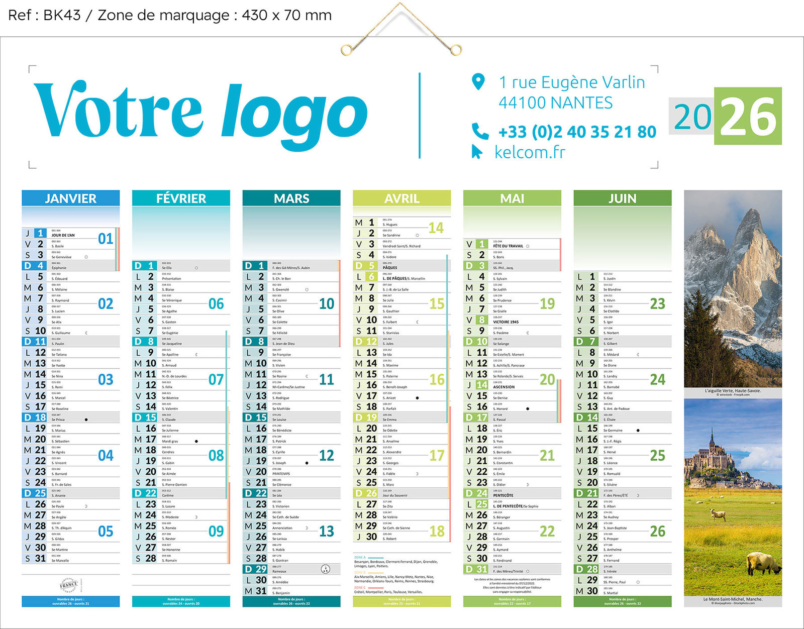 Ce calendrier bancaire, à la grille 6 mois recto-verso, fabriqué en France, au papier couché brillant contrecollé sur carton, issu de forêts durablement gérées, au format Super de 40,5 x 55 cm, nommé 4 Saisons, se définit comme un modèle particulièrement fonctionnel qui délivre un grand nombre d’informations utiles à l’organisation de votre entreprise – numéros de semaines, jours ouvrés et ouvrables, congés par zone scolaire etc. Il est agrémenté de 4 photographies qui représentent chacune une saison de l’année. Vous pourrez aisément l’accrocher à votre mur – il sera alors suspendu par deux œillets et un cordonnet – ou vous en servir comme support ergonomique à disposer sur votre bureau de travail. Ce calendrier bancaire personnalisé 4 Saisons a été conçu à partir d’un papier respectueux de l’environnement, dont l’impression est labellisée Imprim’Vert. Il bénéficie d’un grand espace de marquage de 7 x 43 cm sur lequel vous pourrez apposer votre logo et votre visuel en 1 ou 2 couleurs, avec l’aide précieuse de notre équipe de graphistes Kelcom qui pourra également prendre en charge le publipostage. Un emballage individuel est disponible en option. A noter que des panachages sont envisageables avec les modèles suivants : calCK45 et calBK41. Ce produit est également disponible en format Maxi sous la référence calBK27, en format Medium sous la référence calBK53 et en format Mini sous la référence calBK63. Si vous le désirez, nous pouvons également stocker votre commande et vous l’expédier dès que vous le souhaitez.