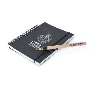 Ce kit d’écriture, composé d’un carnet A6 en carton recyclé et d’un crayon Clip One au choix, nommé Duo Clip A6, se définit comme un coffret destiné à laisser libre cours à votre imagination pour prendre des notes ou réaliser des dessins dès que l’occasion se présente. Il saura contribuer à développer votre esprit créatif. Son carnet de taille compacte est pourvu de 140 pages non lignées de couleur blanche, de spirales dorées, noires ou argentées qui s’avèrent très pratiques pour favoriser une écriture à plat, et d’un élastique déclinable en noir, en marron, ou en gris pour protéger son contenu. Fabriqué en France dans un atelier labellisé « Entreprise du Patrimoine Vivant » qui célèbre les compétences et l’excellence des savoir-faire hexagonaux, ce coffret publicitaire Duo Clip A6 est également doté d’un crayon, pleinement conforme au règlement REACH, dont le clip est facilement fixable à la spirale du carnet. Pour le personnaliser avec style, vous disposez de nombreuses options de marquage, aussi bien sur le carnet que sur le crayon. A vous de déterminer la technique qui vous semble la plus appropriée à votre projet promotionnel parmi celles du marquage à chaud simple, en creux ou 360°. Cette dernière, réalisable uniquement sur le crayon, offre un rendu visuel hautement personnalisé qui saura reproduire à la perfection les logos aux visuels les plus complexes.