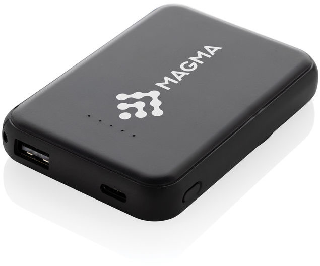 - Batterie de secours de poche 5000mAh avec chargeur magnétique sans fil de 5W, dont le boîtier est fabriqué en plastique ABS recyclé certifié RCS