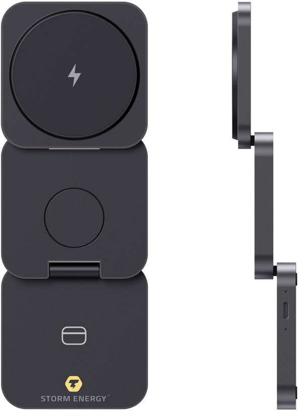 - Le chargeur sans fil est équipé d'un chargeur sans fil magnétique de 15 W et d'un chargeur sans fil supplémentaire de 5 W adapté aux boîtiers d'écouteurs ou à d'autres petits appareils rechargeables sans fil, ainsi que d'un chargeur sans fil de 2,5 W pour les smartwatches (montres Apple uniquement)