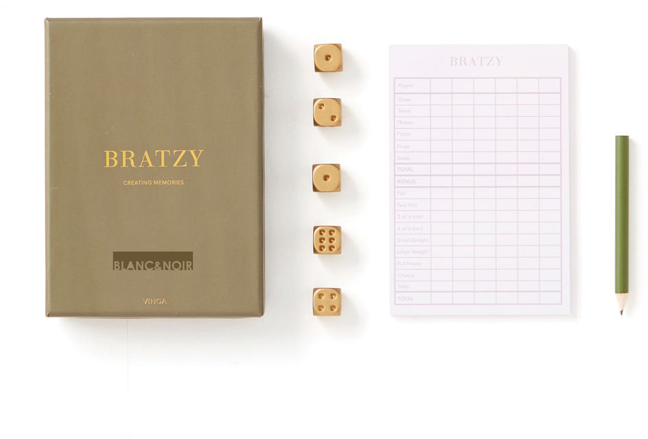 - C'est le Yatzy dans un emballage luxueux ! Avec des dés en or, et un crayon tout aussi exclusif, nous faisons passer le Yatzy au Bratzy