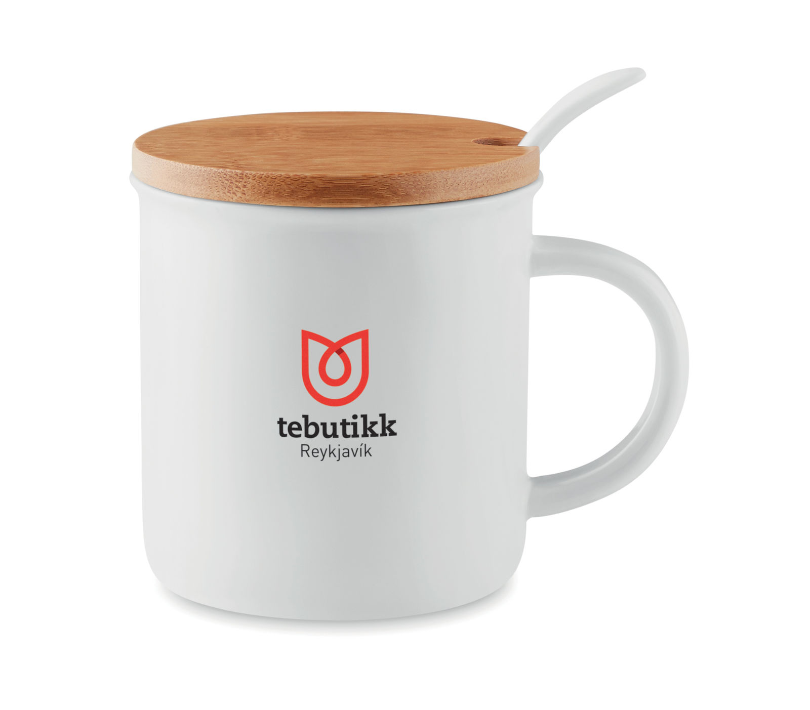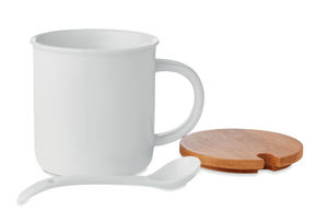 - Mug en porcelaine avec une cuillère et couvercle en bambou