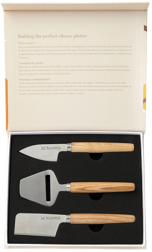- Les couteaux à fromage de cet ensemble raffiné ont des manches en bois de frêne et des lames en acier inoxydable, pour une touche de style supplémentaire sur votre plateau de fromage.