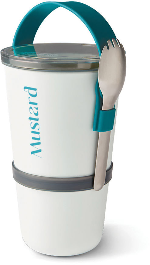 - Les pots sont dotés d'une sangle de transport pratique en silicone qui maintient également la "spork" (cuillère et fourchette) en acier inoxydable