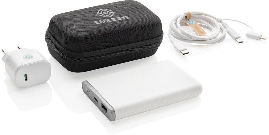 - Comprend un adaptateur UE avec port USB C 20W, un batterie de secours de 5000 mAh et un câble de charge rapide 60W en TPE recyclé de 120 cm (USB C vers USB /Lightning)